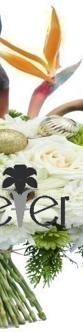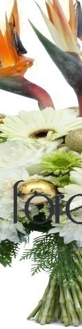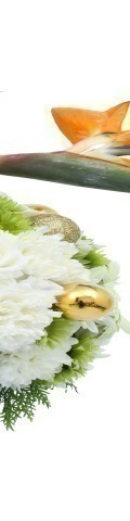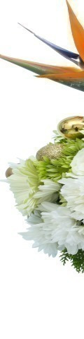 3 White Roses, 3 White Gerbera, White Chrysanthemums, Green Chrysanthemums, 2 Bird of Paradise, 4 Gold Baubles, 2 Silver Baubles
